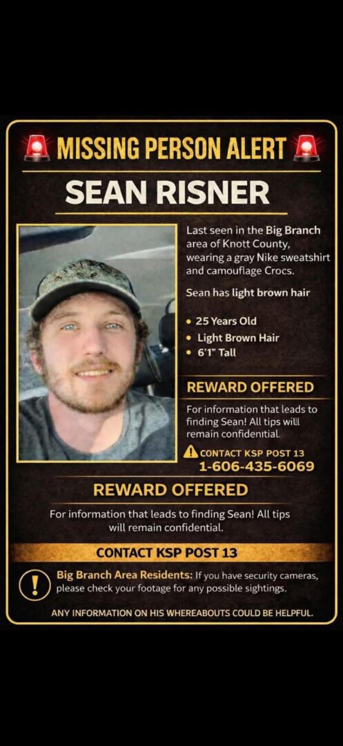 Sean Risner was last seen Saturday in the Big Branch area wearing a gray Nike sweatshirt and camouflage Crocs.